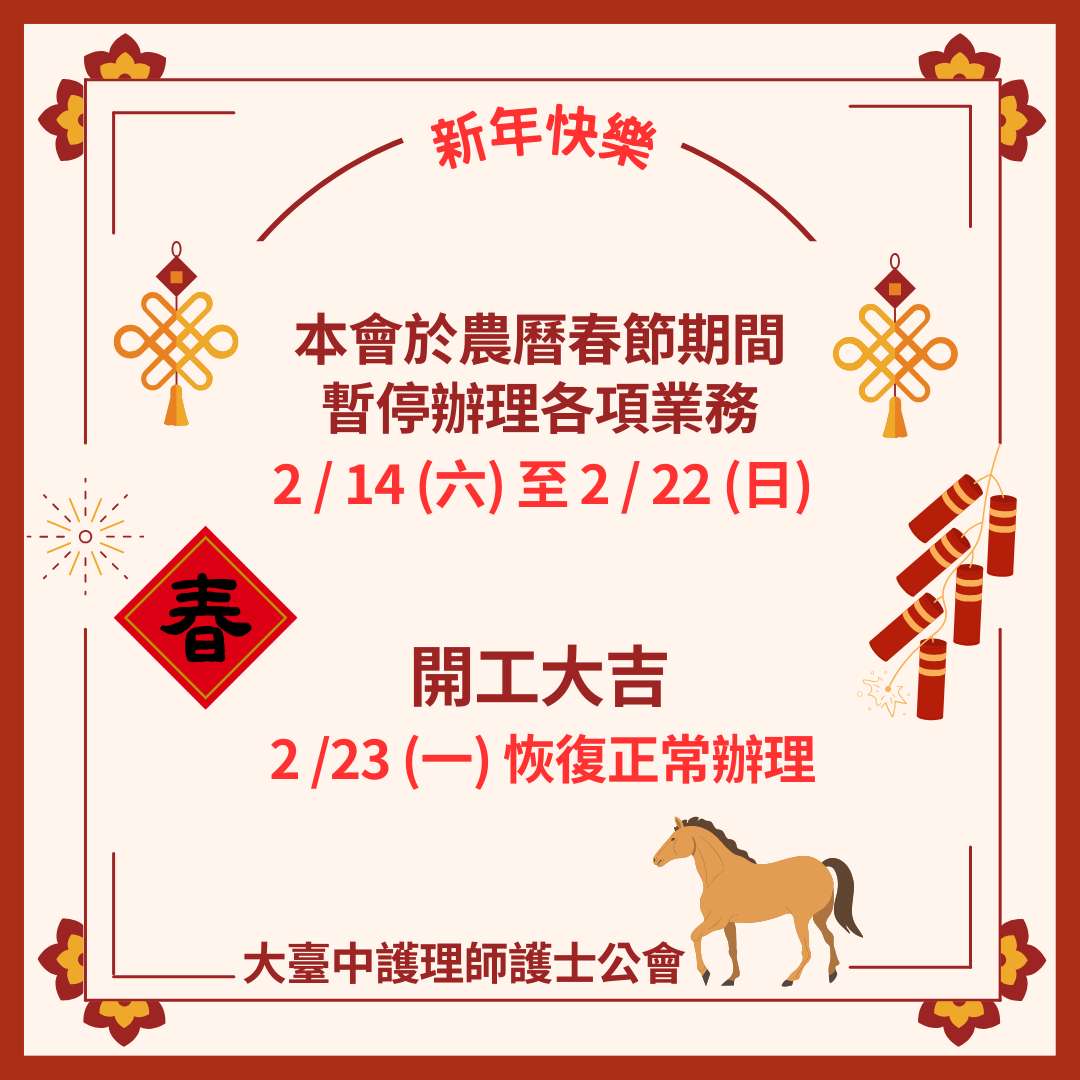 農曆春節連續休假115.02.14(六)~115.02.22(日),配合衛生局暫停辦理各項業務,造成不便,敬請見諒!